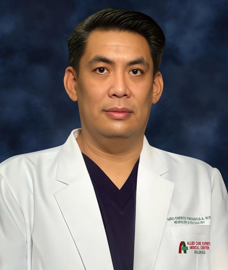 Dr. Niño Emerico S. Porciuncula is a distinguished neurologist and psychiatrist with subspecialty training in Stroke and Vascular Neurology. He earned his Doctor of Medicine degree from the University of Santo Tomas (UST) Faculty of Medicine and Surgery in 2004 and completed his residency in Neurology and Psychiatry at UST Hospital in 2009. He further pursued fellowship training in Stroke and Vascular Neurology at the same institution in 2010. Dr. Porciuncula currently serves as ICU and ER Head at Allied Care Experts Medical Center in Baliwag City, Bulacan. He is also affiliated with several hospitals in the region, including Castro Maternity and General Hospital, Rugay General Hospital, Marcelo Hospital, and Sto. Niño Hospital in Bustos, Bulacan. With a strong commitment to acute neurologic care and stroke management, he is recognized for his clinical leadership and dedication to improving neurologic services in provincial and community-based settings.